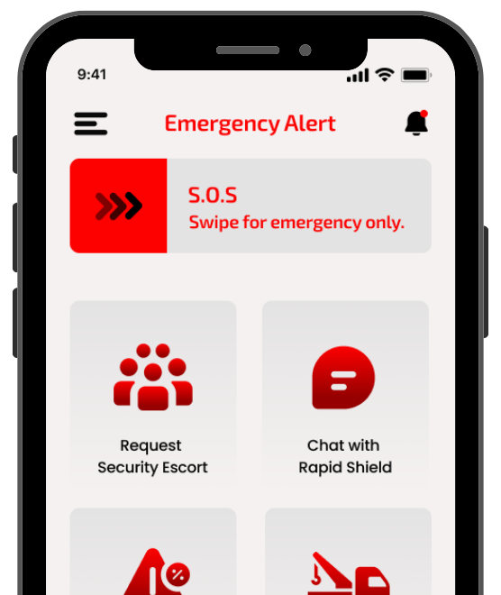 This is the main interface after login. From here, users can quickly access all core services like trigger SOS alerts, book security escorts, request towing or medical support, and report incidents. Clear icons and urgent-friendly layout ensure actions can be taken in seconds.